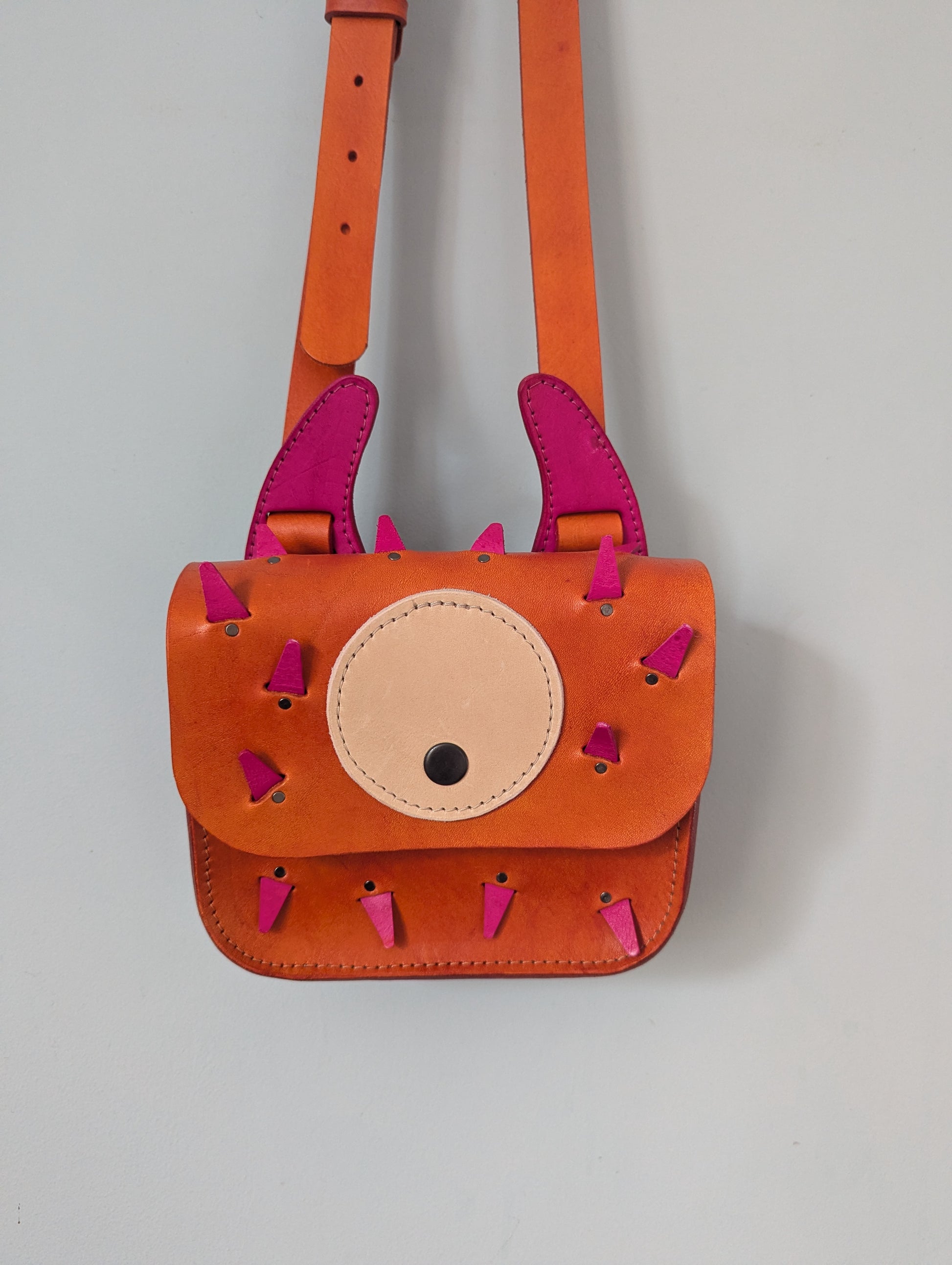 This quirky handmade leather monster bag is a little bundle of fun for your favorite adventurer. Made from high-quality vegetable-tanned leather and hand-dyed in your choice of 15 rich shades for both the bag and the spikes & horns, the design features soft, safe 3D “spikes,” playful monster horns, and a giant cyclopean “eye” that doubles as the closure.